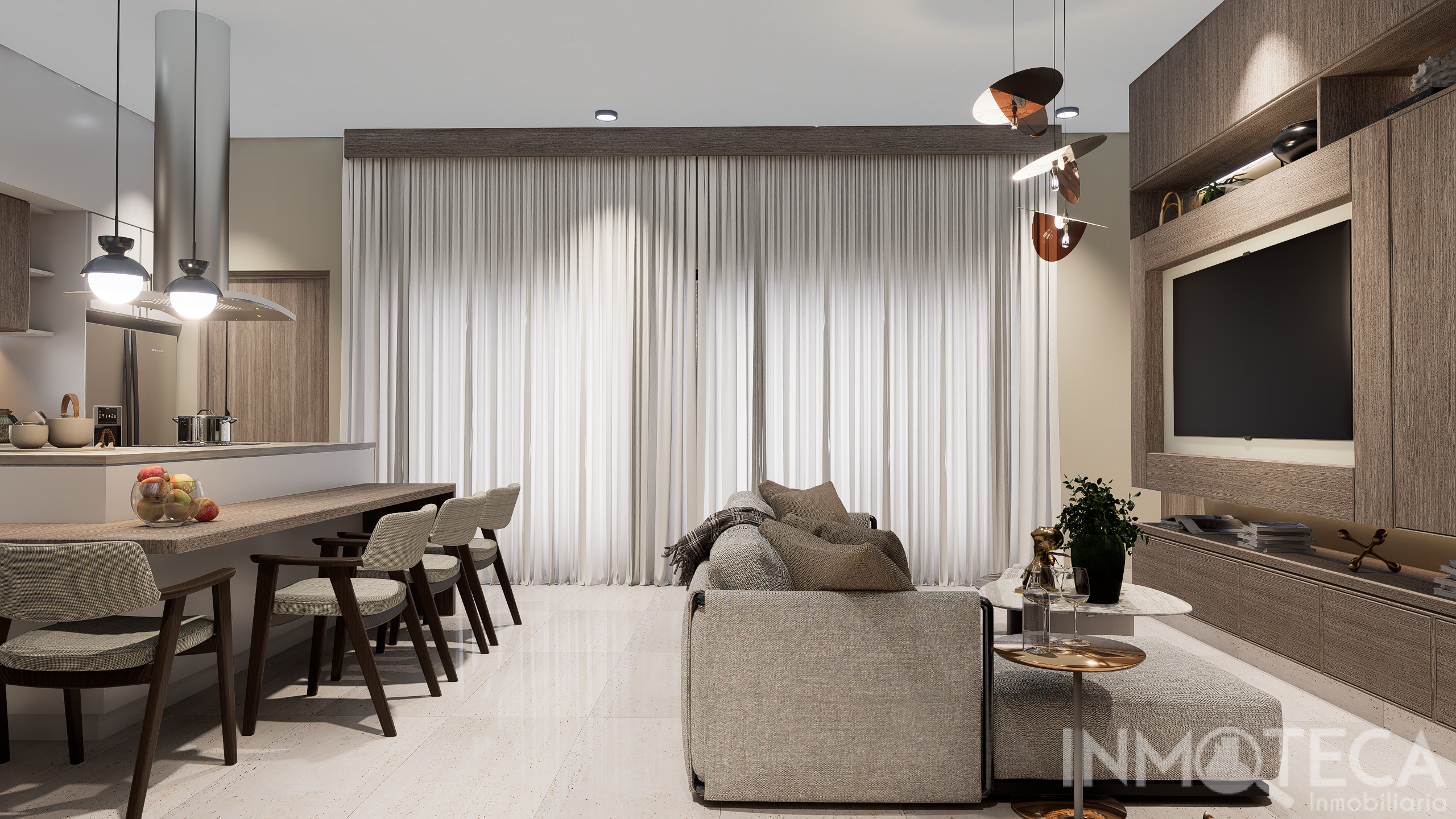Enjoy spaces that merge into an open concept, ideal for family life and entertaining. The large windows not only frame views of the terrace, but also ensure excellent light and natural ventilation. Every detail, from the neutral colour palette to the wood and metal finishes, has been thought out for your well-being.